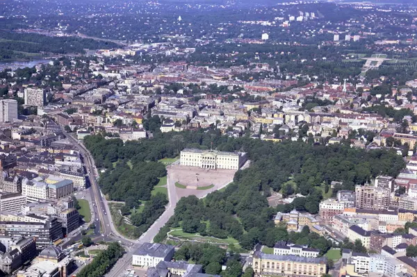 Slottet og Slottsparken. Karl Johans gate opp mot Slottet, Henrik Ibsens gate til venstre for Slottsparken. Ruseløkka til venstre, og Uranienborg bak Slottsparken. (Flyfoto)