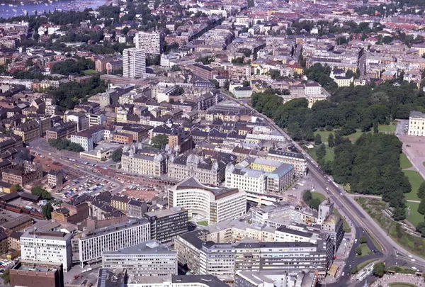 Victoria terrasse og Russeløkkveien med Russeløkkbasarene mot venstre. Henrik Ibsens gate og Slottsparken til høyre. Forretningsbygg i Munkedamsveien og Haakon VII`s gate i front. (Flyfoto)