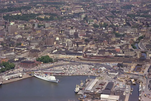Østbanestasjonen med Havnegata foran. "Holger Danske" ligger ved Palèkaia i Bjørvika. Til høyre for den ligger i dag Operaen og Kirsten Flagstads plass. Akerselva og Tomtekaia helt til høyre. Regjeringsbygningen og Oslo Domkirke i bakgrunnen til venstre. (Flyfoto)