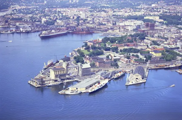 Vippetangen med siloene på utstikker 3, foran Akershusstranda, Forsvarsmuseet og Akershus festning. Aker mekaniske Verksted og Rådhuset i bakgrunnen. (Flyfoto)