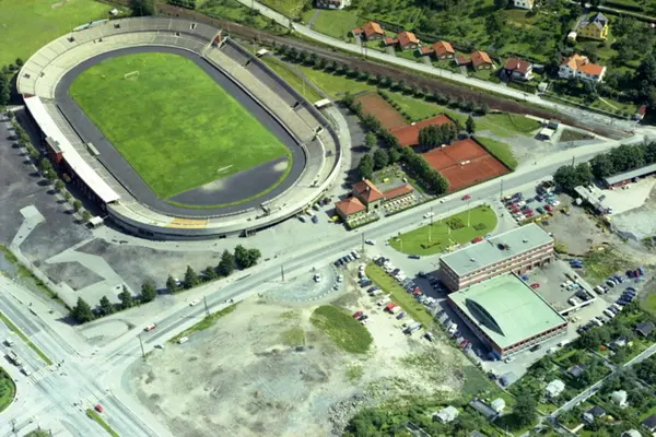 Ullevål stadion med Sognsveien i front, og Ringveien nede til venstre. Trikkesporet til Sognsvannsbanen og Bergslia til høyre for stadion. Sogn hagekoloni nede til høyre.(Flyfoto)
