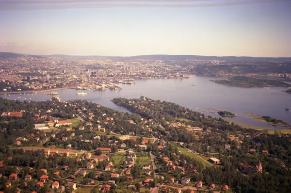 Fredriksborgveien og Lundins vei i front, Huk aveny lenger bak. Norsk Folkemuseum og Vikingskiphuset til venstre. Skillebekk og Filipstad i bakgrunnen. (Flyfoto)
