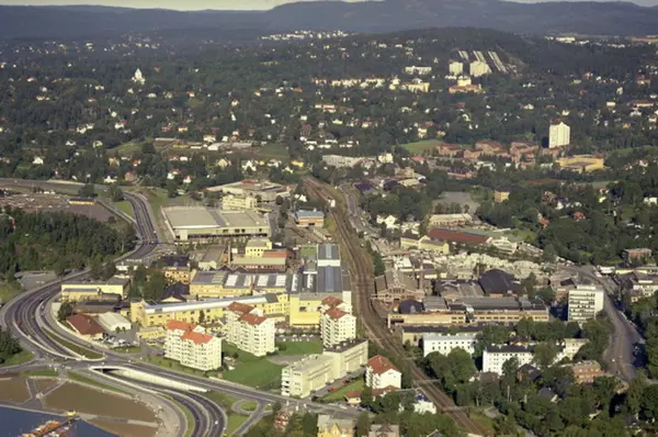 Sjølystveien til venstre, Drammensveien til høyre og Jernbanesporet til Drammensbanen i midten. Messehallen på Sjølyst bak Industriområdet. Ullern i bakgrunnen.(Flyfoto)