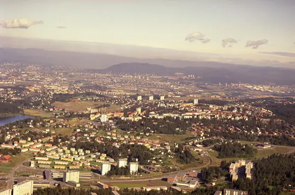 Bøler skole og Ulsrud videregående skole i front. General Ruges vei og trikkesporet til Østensjøbanen bak skolene. Utmarkveien og Guristuveien til venstre. Oppsal og Skøyenåsen i bakgrunnen. (Flyfoto)