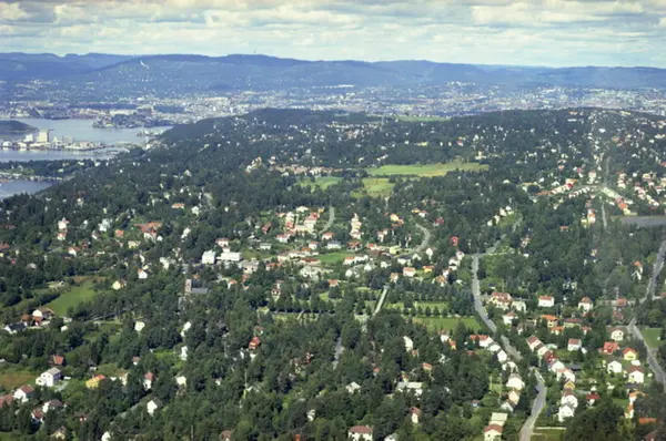 Munkerudveien og Oberst Rodes vei til høyre. Kittel-Nielsens vei og Tyslevveien midt på bildet. Nordstrand kirke foran forretningsbygg ved Sæterkrysset mot venstre. Bekkelagshøgda og Ekeberg i bakgrunnen. (Flyfoto)