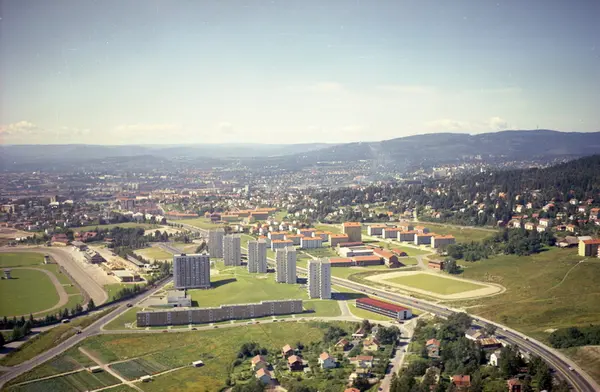 Villabebyggelse i Brobekkveien i front. Boligblokker i Refstadsvingen. Refstadveien nede fra venstre, Trondheimsveien fra høyre. Bjerke travbane til venstre. Årvoll skole bak idrettsplassen. (Flyfoto)