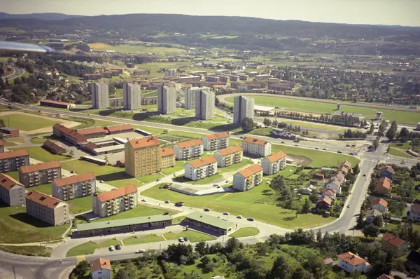 Årvollveien og Skolemesters vei i front. Trondheimsveien krysser Årvollveien til høyre. Årvoll skole bak gul høyblokk. Bjerke og Bjerke travbane i bakgrunnen. (Flyfoto)