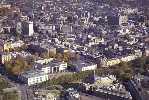 Universtetet i Oslo med Karl Johans gate og Nationaltheatret i front. Fredriks gate nede til venstre. Tullinløkka og Nasjonalgalleriet bak Univeritetet. Trefoldighetskirken og Regjeringsbygningen i bakgrunnen. (Flyfoto)