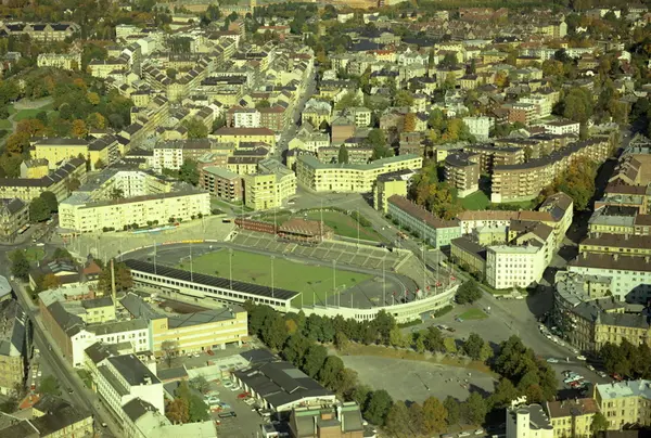 Bislett stadion. Bislettgata i front, Louises gate bak, og Sofies gate til høyre for stadion. Pilestredet til venstre, Colletts gate opp mot høyre. Bolteløkka i bakgrunnen. (Flyfoto)