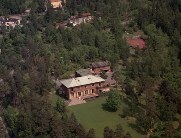 Villa Lyse (oppført 1933 av arkitekt Arnstein Arneberg), Hoffsjef Løvenskiolds vei 31C. Fra 1953 eid av Nils Astrup. Nå Montessoriskolen Lyse. (Flyfoto)