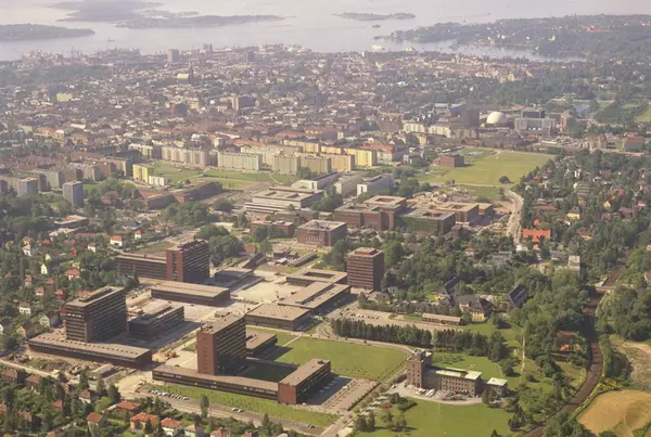Universitetet i Oslo. Meteorologisk institutt til høyre. Niels Henrik Abels vei i front. Problemveien til høyre for Universitetet. Trikkesporet til Sognsvannsbanen helt til høyre. Marienlyst og Majorstua i bakgrunnen. (Flyfoto)