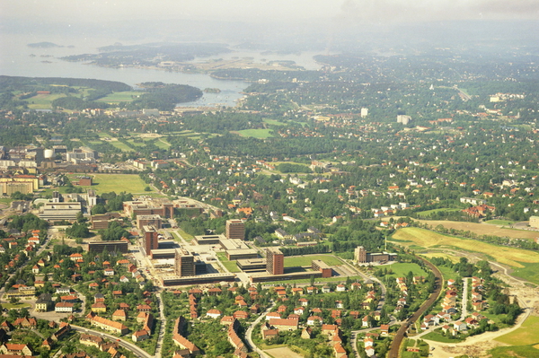 Univeritetet i Oslo. Fra venstre i front, Prestegårdsveien, Sognsveien, Moltke Moes vei, Eventyrveien, Tyrihansveien, Trikkesporet til Sognsvannsbanen og Bukken Bruses vei. Frognerparken og Skøyen i bakgrunnen. (Flyfoto)