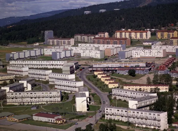 Boligblokker og rekkehus på Veitvet. Veitvet skole, Veitvet senter, Rådyrveien, Grevlingveien, Veitvetsvingen. Trondheimsveien og Sletteløkka i bakgrunnen (Flyfoto)