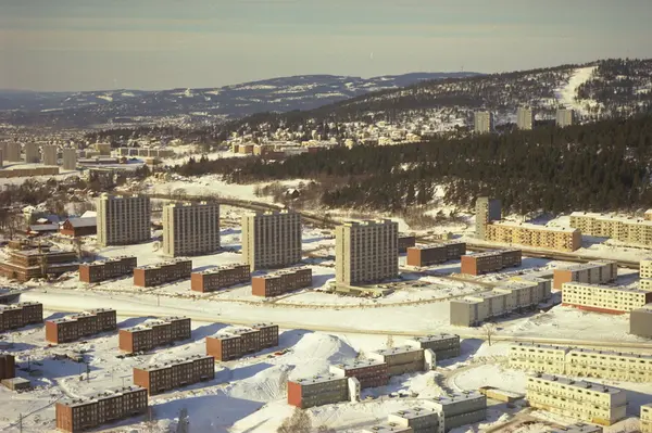 Boligblokker i Linderudveien og Beverveien i front. T-banesporet til Grorudbanen bak de nærmeste Boligblokkene. Statsråd Mathiesens vei foran Høyblokkene. Bjerke videregående skole under oppføring til venstre. Trondheimsveien i bakgrunnen. (Flyfoto)