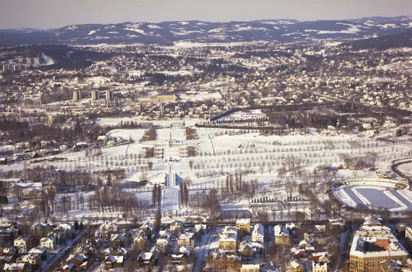 Frognerparken og Frogner stadion. Fra venstre, Gyldenløves gate, Munthes gate, Fuglehauggata og Professor Dahls gate. Kirkeveien i front av Frognerparken. Heggeli og Smestad i bakgrunnen. (Flyfoto)
