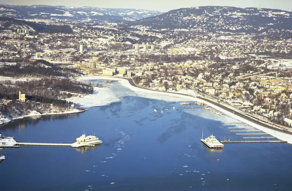 Frognerkilen med restaurantene Kongen og Dronningen. Bygdøy og Oscarshall lystslott til venstre, Frogner og Frognerstranda til høyre. Skøyen i bakgrunnen. (Flyfoto)