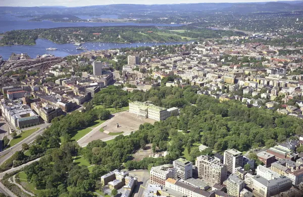 Slottet og Slottsparken. St. Olavs gate og Nordraaks plass i front. Uranienborg bak, og Henrik Ibsens gate og Ruseløkka til venstre for Slottsparken. Bygdøy helt i bakgrunnen. (Flyfoto)