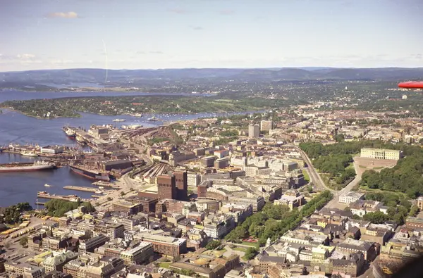 Stortinget og Eisvolls plass i front. Rådhuset og Nationaltheatret lenger bak. Akers mekaniske Verksted til venstre. Slottet, Slottsparken og Universitetet i Oslo til høyre. Bygdøy helt i bakgrunnen. (Flyfoto)