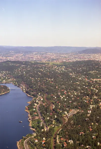 Mosseveien og Jernbanesporet til Østfoldbanen. Villabebyggelse i Solveien og Vingolfveien. Ulvøybrua, Bekkelaget og Bekkelagshøgda i bakgrunnen. (Flyfoto)