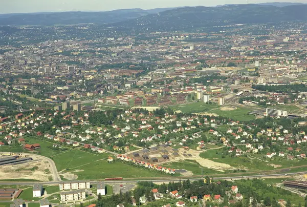 Ringveien og T-banesporet til Lambertseterbanen foran villaområde på Høyenhall. Manglerudveien og Høyenhallveien nærmest T-banesporet. Traktorveien til venstre. Boligblokker og villabebyggelse i Otto Sogns vei og Wetlesens vei helt i front. Etterstad og Vålerenga i bakgrunnen. (Flyfoto)