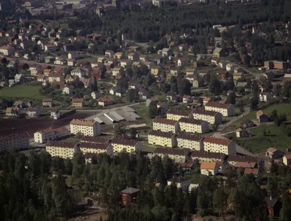 Boligområde. Myrerfeltet til venstre, blokkene i Myrerskogveien og Nordstjerneveien. Kjelsåsveien, Grefsenveien, Myrerveien, Nordstjerneveien, Kurveien. I bakgrunnen Grefsen kirke? (Flyfoto)