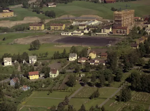 Villabebyggelse. I bakgrunnen Grorud idrettsplass med tyskerbrakkene som klubbhus. Boligblokker og byggevirksomhet på Grorud senter. I front Grorud kirkegård. (Flyfoto)