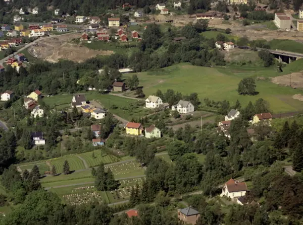 Teppaveien og Grorud kirkegård i forgrunnen. Grorudveien, Rasmusbakken. Karl Flodsvei. Grorud kirkegård. Trondheimsveien (rv4) krysser Alnaelva i høyre bildekant. (Flyfoto)