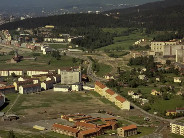 Nordtvet skole i nedre bildekant. De hvite blokkene til venstre ligger i Nedre Kalbakkvei, de gule i Kalbakkveien. Sletteløkka til venstre bak Kalbakken. Høyblokkene på Rødtvet til høyre. Kalbakkveien møter Trondheimsveien midt i bildet.