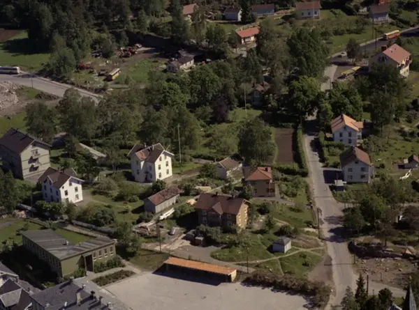 Pastor Blaauws vei på Grorud i Oslo, spiret på Grorud kirke skimtes nede i høyre bildekant. Grorud skole(gård) nede til venstre i bildet. Grorudveien. (Flyfoto)