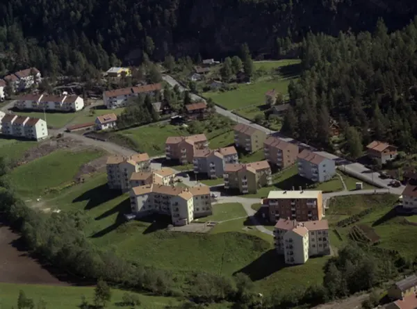 Blokkbebyggelse i Hagelundveien på Grorud. Bergensveien i bakgrunnen av bildet. Den oransje blokken som skiller seg fra stjerneblokkene er Hagelundveien 2. Solhaug øverst til venstre. (Flyfoto)