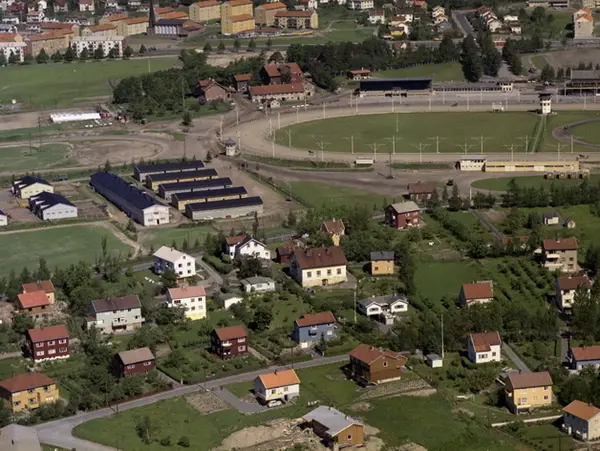 Bjerke travbane, Bjerke gård. Gruppen hus med svarte tak er staller tilhørende Bjerke travbane. Gul bygning midt på bildet er staller for tilreisende hester. Økernveien, Lundliveien, Skogvollveien (Flyfoto)