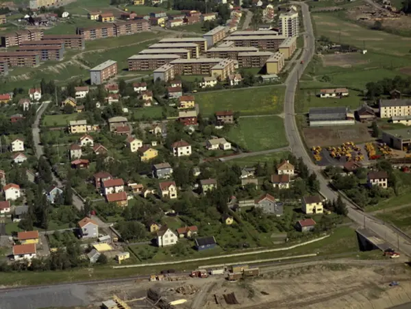Brobekkveien fra krysset ved (nåværende) Østre Aker vei. Risløkkafaret, Midtveien, Anton Tschudis vei, Kryssveien, Brobekkveien. I forgrunnen byggingen av T-banen og Østre Aker vei. (Flyfoto)
