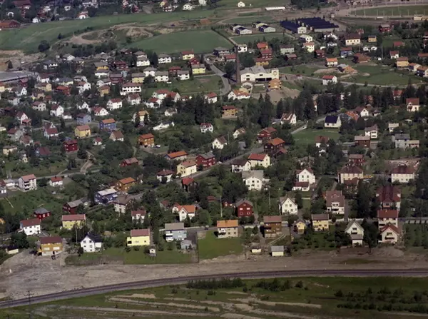 Bjerkebanen bak til høyre. Villabebyggelse Refstadområdet. Norsk raffineringverk, Lundliveien 11. TiI venstre Samas-bygget. Økernveien. Nordalveien. Oreliveien. Skogvollveien. Risløkkveien. I front bygging av Østre Aker vei og t-bane. (Flyfoto)