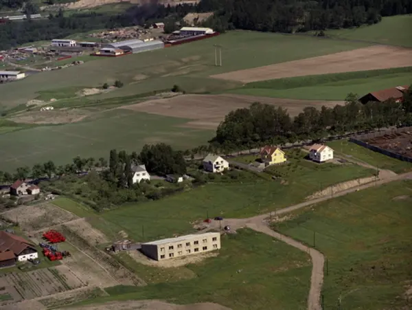 Strømsveien 277-286. Eneboliger i Verkseier Furulunds vei. Stubberudveien. Låven på Nedre Stubberud til venstre, litt av Alfaset gård til høyre. Jordene bak er i dag Alfaset gravlund. I bakgrunnen Alfaset Industrivei. (Flyfoto)