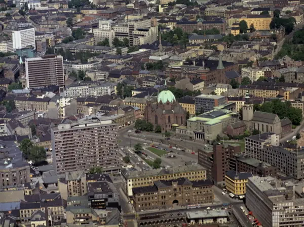 Oslo sentrum. Folkets hus og politistasjonen i Møllergata 19. På Einar Gerhardsens plass regjeringskvartalet med den såkalte høyblokka. Deichmanske bibliotek, Trefoldighetskirken med fronten mot Akersgata, od den svenske Margaretakyrkan. Ett stykke opp i Akersgata den katolske kirken St. Olavs kirke. Det gamle Rikshospitalet i beliggende i Pilestredet 32.
