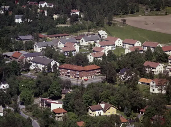 Ekebergveien. Lambertseterveien. Kastellveien i front. I bakgrunnen Nyquistveien, Lambertstien og jordene til Nordseter gård (nå bebygd). Gult trehus foran mursteinbygning (skjult) er hovedhuset til Kastellet gård. (Flyfoto)