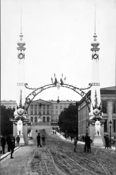 Smykket portal i Karl Johans gate ved Universitetet, i anledning den tyske keiserens (Vilhelm IIs) besøk. Slottet i bakgrunnen. Se også serien A-20189/U/001/002 - A-20189/U/001/011.