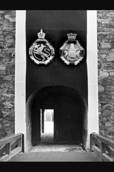Inngangsportal med riksvåpenet / riksløve og byvåpen som markerer inngangen til utstillingen på Akershus festning. For mer informasjon om jubileumsutstillingen - se artikkel i Tobias nr 1, 2000