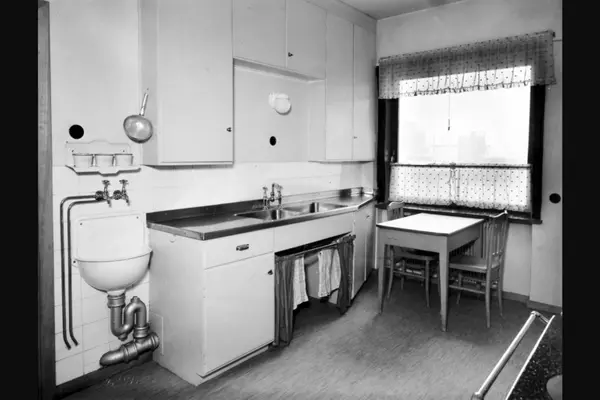 Tjenestekjøkken med oppvaskbenk, overskap og utslagsvask. Spiseplass. Albumtittel: "Oslo hovedbrannstasjon" (eg. identisk bildetittel til alle bildene i albumet)