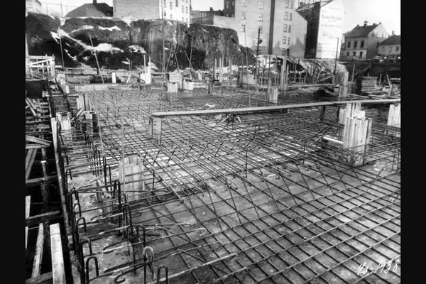 Armering av dekke over de bombesikre rum med kasser for gjennemføring av rør. Billedet tatt mot Henrik Ibsens gate.