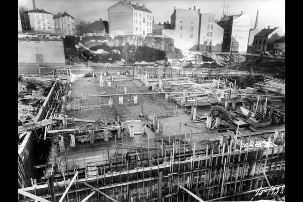 Gulv over kjeller i hovedblokken ferdig forskallet og delvis armert. Tilvenstre sees kanal for utsuging av exhaustgassen fra vognhallen. Billedet tatt fra Hospitalsgata.