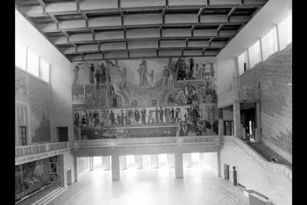 Oslo Rådhus (Rådhuset). Sørveggen i Rådhushallen (Sentralhallen) med inngangsparti og maleriet "Arbeid, administrasjon og fest" av Henrik Sørensen. Trapp opp til baldakin og balkonggang.