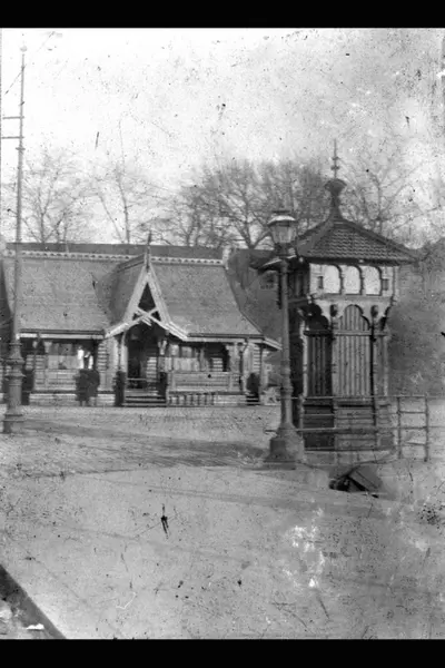 Ventehall for fjordbåtpassasjerer på Piperviksbryggen ved Tordenskiolds plass nedenfor Kontraskjæret. Oppført 1883. Laftet tømmerbygning i dragestil. Flyttet 1935 til Norsk Folkemuseum. Klokketårn? i forgrunnen. (Jfr. bilde A-20031/U/0013/001 og 002)