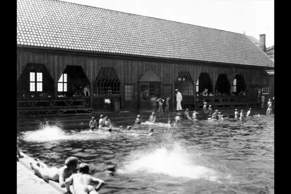 Kampen Friluftsbad ("ishuset"). Gutter i bassenget og i hallbygningen. Bademesteren passer på. Badet åpnet i 1921, nedlagt i 1946, lå bak Kampen skole, i Elverumgata 14.