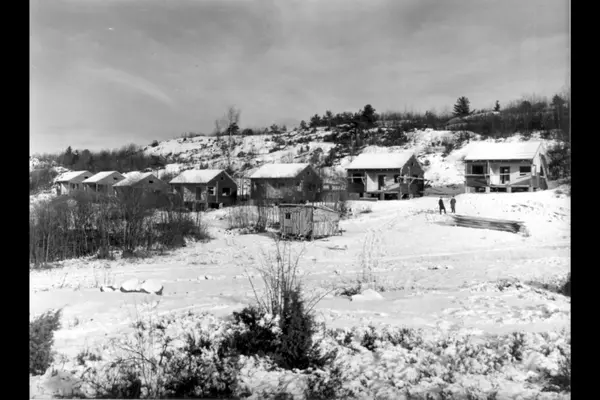 Sanitetshyttene - Minnegavehyttene, 9 hytter ved kanten av Brannfjell, bygget av Norsk Kvinners Sanitetsforening, sommerboliger for tuberkuløse, ferdig i 1925. Brannfjellområdet bakenfor.