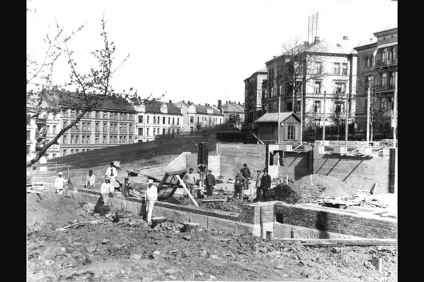 Bygningsarbeidere med grunnmur-arbeide til Ullevålsveien særskole. (Senere benevnt som hjelpeskole.) Bebyggelse i Sofies gate til venstre og i Ullevålsveien opp til høyre. (Jfr. bilde A-20031/U/0014/091)