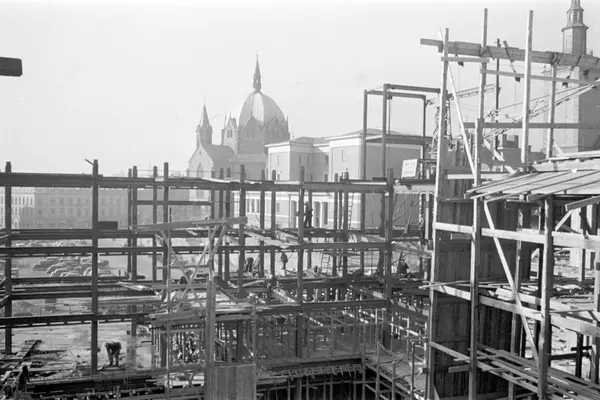 Byggeplass, Oslo hovedbrannstasjon, reisverk, stillas. Deichmanske bibliotek og Trefoldighetskirken i bakgrunnen. Ved daværende Henrik Ibsens gate, nåværende Hammersborggata.