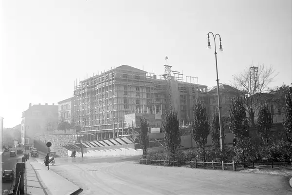 Byggeplass. Oppussing, påbygging ved Ruseløkka skole. Gatelykt. Ruseløkkveien nede til venstre, Løkkeveien opp i midten, Victoria Terasse opp nærmest. Gatemiljø.