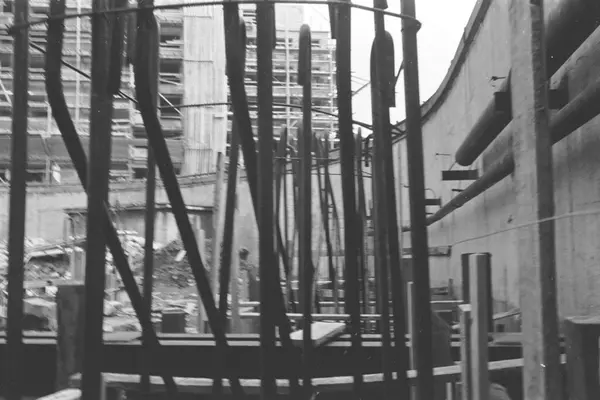 Byggeplass. Graving. Armering. Jernbinding. Forskaling. Bygging av nytt retortanlegg (ovner der kull ble oppvarmet for å avgi gass) til Gassverket. Høyhus under oppførelse (Storgata 38, Blå Korshuset).