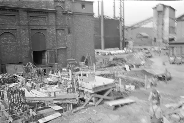 Byggeplass. Armering. Jernbinding. Forskaling. Gassverkets teglsteinsbygning. Bygging av nytt retortanlegg (ovner der kull ble oppvarmet for å avgi gass) til Gassverket. Gassklokken i bakgrunnen. (Anker studentboliger ligger her idag.)